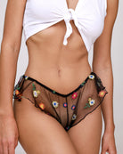 ANITA - d'inspiration Gipsy, ce tanga 100% sexy en polyester est doublé d'un coton eoko-tex pour votre intimité. Entièrement transparente, son voile noir laisse place à des fleurs brodées et colorées pour un look rétro cute.
