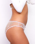ANGELA - le tanga dans lequel on retrouvé littéralement toute l'âme de la marque: la femme qui n'a pas oublié qu'elle a d'abord été une enfant, pleine de rêves, pleine de douceur. Un tissu transparent ultra doux et léger, brodé de petites fleurs délicates aux tons vieillis, et par dessus tout, une couture de bords que vous avez choisi! En voile polyester elasthane, doublé d'un jersey de coton eoko-tex.